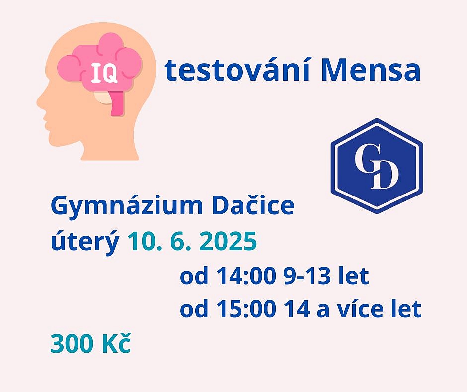 V úterý 10. června pořádáme na gymnáziu ve spolupráci s Mensou ČR testování IQ. Zájemci o testování z řad studentů i veřejnosti se mohou přihlásit na těchto odkazech: