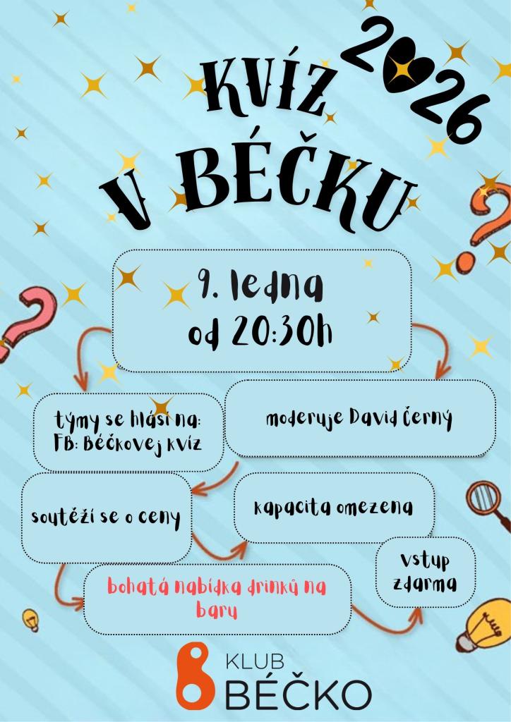 první kvíz tohoto roku moderuje David Černý soutěží se o ceny týmy se hlásí na FB skupině Béčkovej kvíz