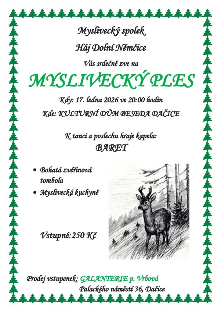 Myslivecký spolek Háj Dolní Němčice vás zve na tradiční myslivecký ples. - bohatá zvěřinová tombola - myslivecký kuchyně - kapela Baret - vstupné 250 Kč