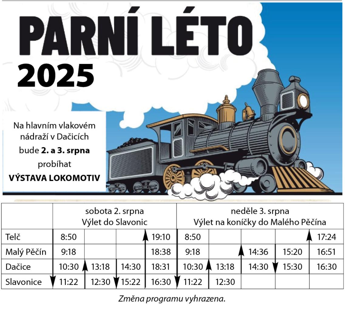 Jízda historického parního vlaku. Vlak staví ve všech běžných zastávkách. Jízdenky zakoupíte přímo ve vlaku. Jízdné najdete na přiloženém plakátu.